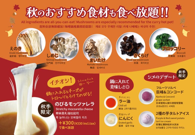 さらに+300円(税込330円)で追加できる「のびるモッツァレラ」を加えて、とろーりチーズカレー鍋もお楽しみいただけます!