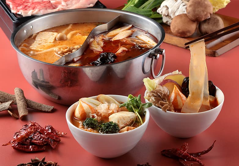 2色鍋しゃぶしゃぶ食べ放題に刺激的で香り高いスープをプラス、選べる2種類の特製だしをご用意いたしました。