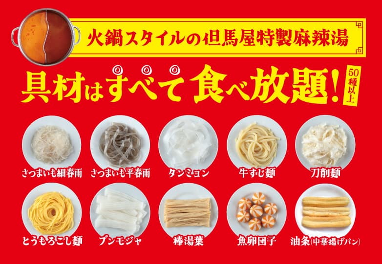 さらに!麻辣湯専門店でも人気の7種の麺+3種の具材をラインナップ。当店はすべてビュッフェ形式で「食べ放題」!もちろん、お肉・野菜などの鍋具材や薬味、デザートなども制限時間内で好きなだけお楽しみいただけます。