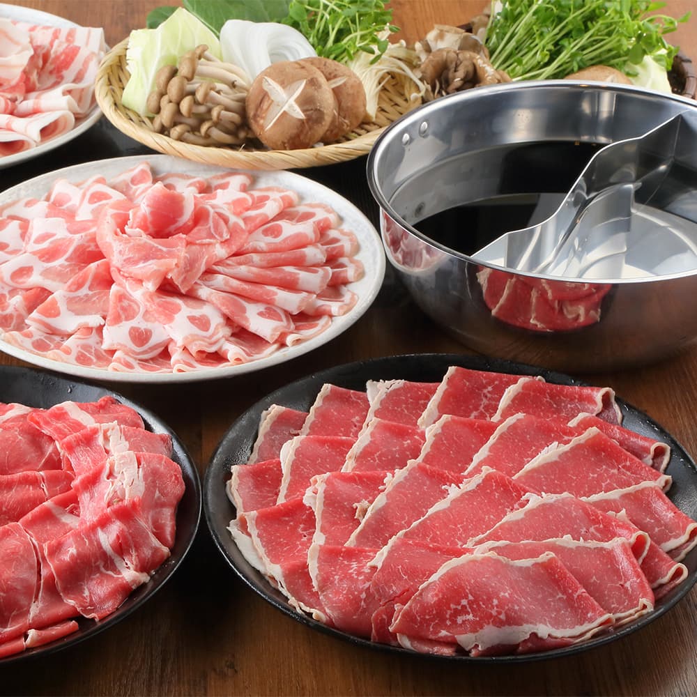 2色鍋しゃぶしゃぶorすき焼き食べ放題に飲み放題が付いた、大満足の宴会プラン。90分たっぷり楽しめて、ランチもディナーもご利用OK!